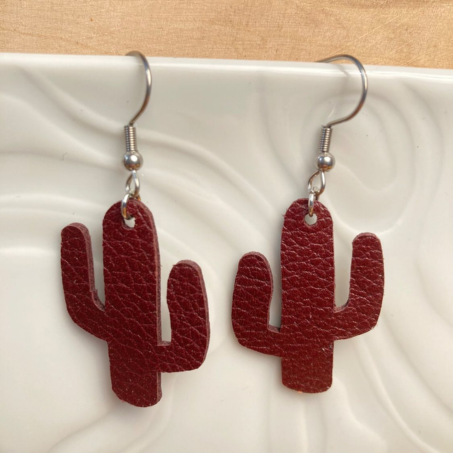 Boucles d'oreilles avec cactus en cuir doublé marron. Tiges et anneaux en laiton brut.